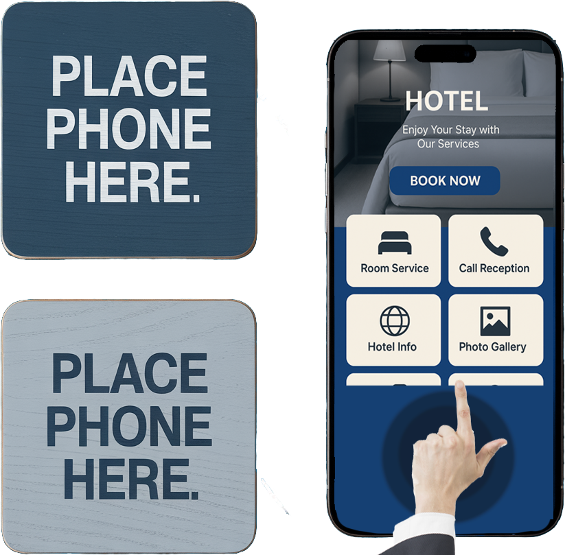 Korisnik približava telefon i jednim dodirom otvara personalizovan sadržaj – meni, recenzije, forma, link, video, Wi-Fi...